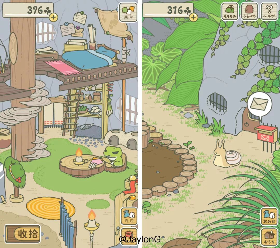旅行青蛙的画风偏简洁,更是给人带来萌萌的感觉,朴素的配色让人觉得看久了也相当舒服,游戏的颜值就摆在这里了,加之轻快的BGM,让人觉得惬意和放松。