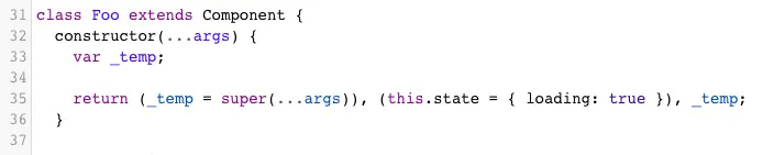 请注意这里 Babel 实际上是传递了所有参数到 super - 不仅仅是 props。它也会将 super 的返回值传递回调用者。两者虽然感觉有些小题大做,但确实需要这样。