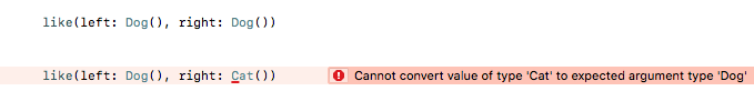 嗯,看起来是正常工作了。Dog和Dog可以like,Dog和Cat不可以!因为like函数里的left与right两个参数类型必须要相同。不同的话,编译器就会提示错误了!
