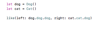 这样子也可以!前面的两个是不对的cat和dog是不能like。但是编译时也没有报错。因为只要链式最后的那个对象类型相同就可以了!并没有解决问题啊!
