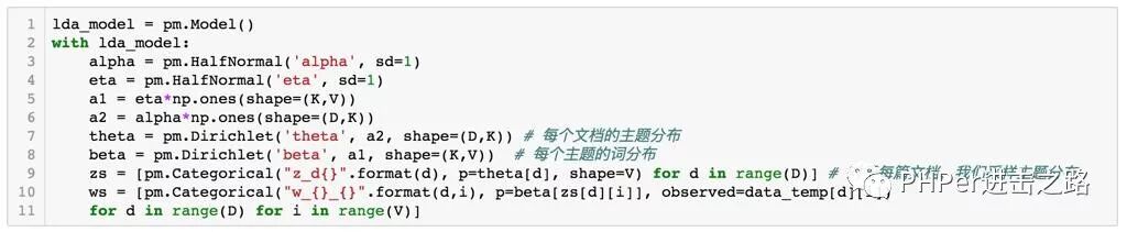 可以说 pymc3 写出来的代码真是简洁。but。就是太慢了,完整的代码可以看 gibbs-lda。