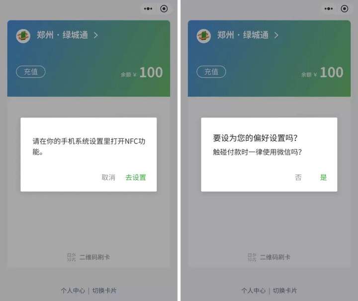 - Step 2:在手机设置里打开NFC开关,并将微信设置为默认NFC应用(非NFC手机用户则直接获得乘车二维码);