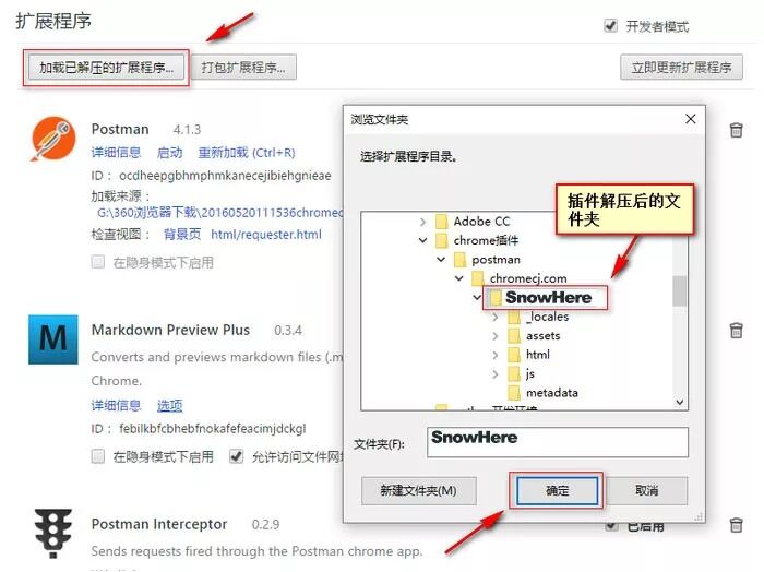 在勾选开发者模式选项以后,在该页面就会出现加载正在开发的扩展程序等按钮,点击“加载正在开发的扩展程序 ”按钮,并选择刚刚解压的文件夹的位置。