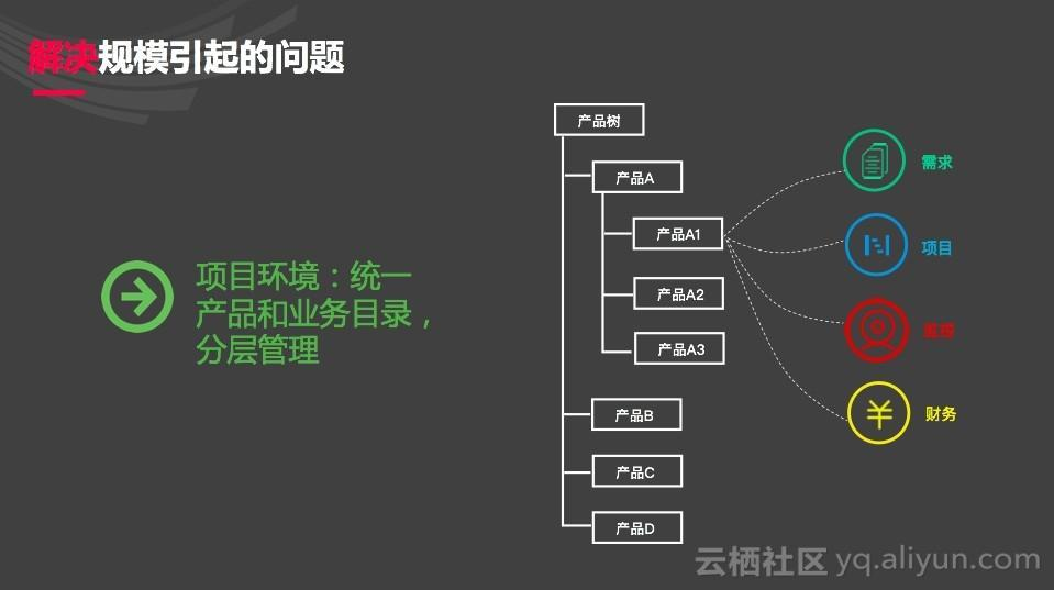 然后,通过分析阿里巴巴在规模、关联、变化三个方面的复杂度及挑战,引出了云效平台如何根据阿里巴巴的场景和问题,进行产品和项目的分层管理,支持横向和纵向的项目组织方式,统一“分析-设计-实现-交付”的协作过程,同时通过看板来聚焦价值流动,快速迭代验证来拥抱变化。