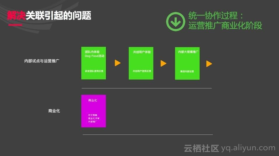 首先,他谈到阿里巴巴业务面临的众多挑战,比如用户场景众多、产品业务组织和管理困难、团队研发并行度高;同时业务和产品的相互关联呈现出网状结构,导致多头管理及爆炸性沟通,影响整体协作和产品决策;另外,业务变化快、节奏快,不确定性非常高等。
