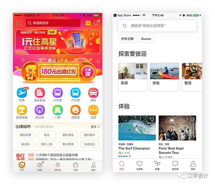 设计师要审视产品定位、产品价值、产品目标。例如,喜欢旅游的人士都熟悉的两个App:Airbnb与飞猪。Airbnb是一家联系旅游人士和家有空房出租的房主的服务型网站,它可以为用户提供多样的住宿信息;飞猪是为淘宝会员提供机票、酒店、旅游线路等商品的综合性旅游出行网络交易服务平台;两者都是为用户的旅游提供帮助,但是产品的视角却大相径庭。这就要求设计师在设计时紧随产品策略和产品核心价值,这样做出的设计才不会跟产品初衷相违背。