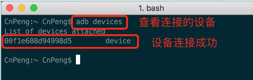 2、 打开 终端,输入 adb devices , 查看手机和电脑是否连接成功。如下图: