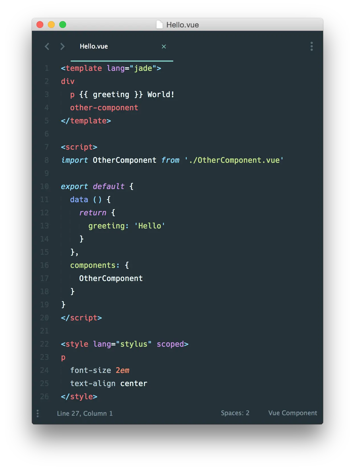 这是一个文件名为 Hello.vue 的简单实例: