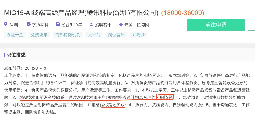 总结以上的三个巨头的招聘需求,我们不难发现其共同点,AI产品经理除了需要具备互联网产品经理的基本技能之外,行业/场景和技术称为最频繁提及的字眼,在技术方面也只是提及了需要对人工智能基础有大志的了解,也就是说在技术方面并不要求产品经理打到能够研发产品的水平,这一点和互联网的产品经理的要求很相似,重点的要求其实还是在场景挖掘和行业经验方面。