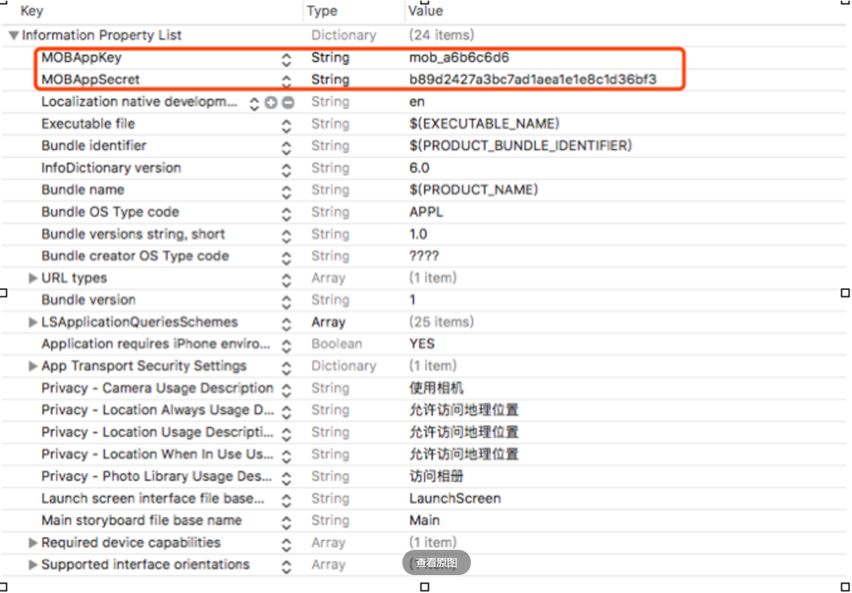 首先在info.plist里添加2个字段:MOBAppKey和MOBAppSecret,对应在mob申请的key。(不用写初始化方法了)