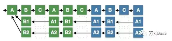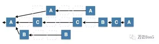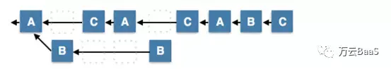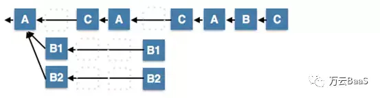 为了帮助解释这个算法,我想假设3个块生产者A,B和C。因为共识(的达成)需要2/3+1多数来解决所有情况,这个简化的模型将假设生产者C是打破僵局的那个人。在现实世界中,将有21个或更多的块生产者。像工作量证明一样,一般规则是最长链胜出。任何时候当一个诚实的对等节点看到一个有效的更长链,它都会从当前分叉切换到更长的这条链。