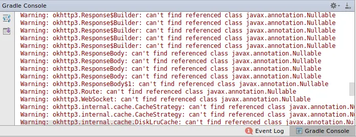 OkHttp 库在 3.8.0 版本的类中添加了新的注解(javax.annotation.Nullable)。但是因为它们使用了编译时的依赖,所以这些注解在最终构建时不会被打包进去(哪怕应用显式的依赖了 com.google.code.findbugs:jsr305),因此 ProGuard 会抱怨 缺失了这些类.