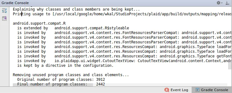在您读 ProGuard 手册时,您没必要看那些 输入 / 输出的部分,因为这些 Android Gradle 打包插件会替您指定输入源(您和第三方库的代码) 和 Android jar 库(您构建应用时用到的 Android 框架类)。