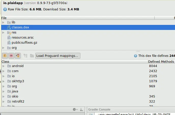 当您加载了映射文件到 APK Analyzer时(点击 “Load Proguard mappings… “ 按钮), 您可以在 DEX 视图树中看到一些额外功能: