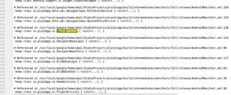 AAPT 也会 keep 住所有在 XML 布局文件使用到的 View 类(和它们的构造函数)和其他一些类,如在过渡动画资源中引用到的过渡类。 您可以在构建后直接看这个 AAPT 生成的配置文件,位置是:<your_project>/<app_module>/build/intermediates/proguard-rules/<variant>/aapt_rules.txt。