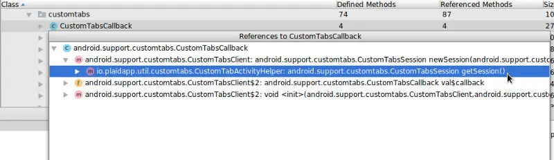 另一种方法不那么精准,但在任何应用都不需要重新构建和额外的工作量。那就是在 APK Analyzer 中打开 DEX 文件,然后右击您关注的类、方法。选择 “Find usages” 您将看到引用链,这也许会引导您了解哪部分代码使用指定的类、方法从而阻止了它被移除。