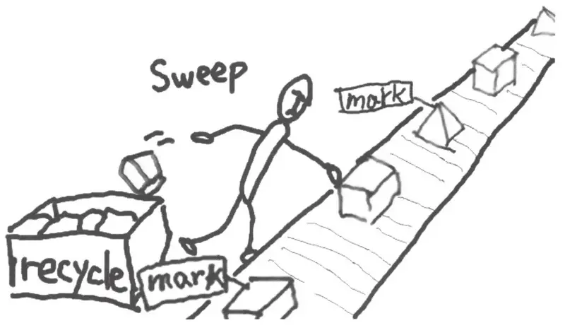 又要遍历,这次是遍历整个堆,回收没有打上标记的对象。