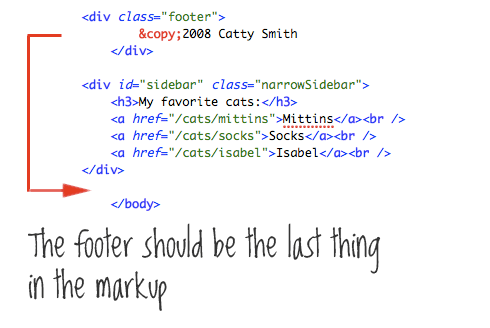 这是一个很少见的错误情况,因为我想大家写页面都不会把逻辑顺序打乱,换句话说,如果可能的话,让你的网站具有一个先后逻辑顺序是最好的,比如说先写页头,在写页体,最后写页脚。当然有时也会碰到特殊情况,如何页脚部分在于我们代码的边栏以上,这可能是因为它最适合你的网站设计需求,这样或许是可以理解的,但是如果你有别的方式实现,我们都应该把页脚是放在一个页面的最后,然后在通过特定的技术让它达到你的设计需求: