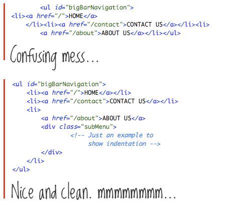 在页面编辑中,代码的缩进有没有正确,他不会影响你网站的任何功能,但要是你没有一个规范的缩进原则,让读你代码的人是非常的生气,所以说正确的代码缩进可以增强你的代码可读性。标准程序的缩进应该是一个制表符(或几个空格),形像一点的我们来看下文章开头那张图,或者一起来看下面展示的这张图,你看后就知道以后自己的代码要怎么样书写才让人看了爽: