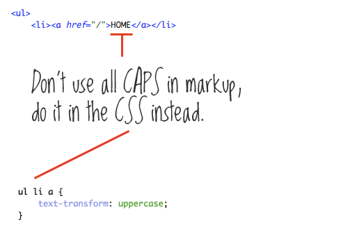 我们在设计菜单时,有时要求所有菜单选项的文本全部大写,大家平时是不是直接在HTML标签中就将他们设置成大写状态呢?如果是的话,我觉得不好,如果为了将来具有更好的扩展性,我们不应该在HTML就将他们设置为全部大写,更好的解决方法是通过CSS来实现: