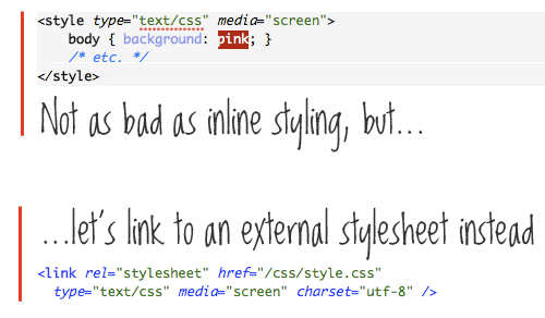 页面中写入CSS样式有很多种方法,有些直接将样式放入页面的“<head>”中,这将是一个很不好的习惯,因为这样不仅会搞乱我们的标记,而且这些样式只适合这一个HTML页面。所以我们需要将CSS单独提出,保存在外部,这样后面的页面也可以链接到这些样式,如果你页面需要修改,我们也只需要修改样式文件就可以。正如下图所示: