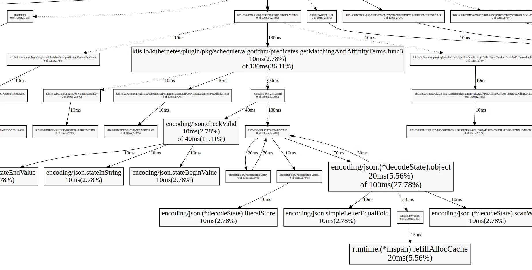 因为原图比较大,这里只截取了其中一部分,但是能明显看到 encoding/json.(*decodeState).object 是这里耗时比较多的地方,而且能看到它调用了哪些函数,分别函数多少。这些更详细的信息对于定位和调优性能是非常有帮助的!