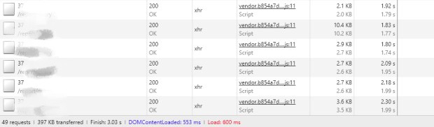 由于项目不算十分复杂,接入的过程算是波澜不惊。唯一的麻烦是工期比较紧,因而分两步走:一期先接入 Node,所有页端请求原样转发 Java,返回的结果原样转发页端。二期对数据获取的接口进行整合与优化以提升性能。完成后收益还是客观的,贴两张图展示下成果。