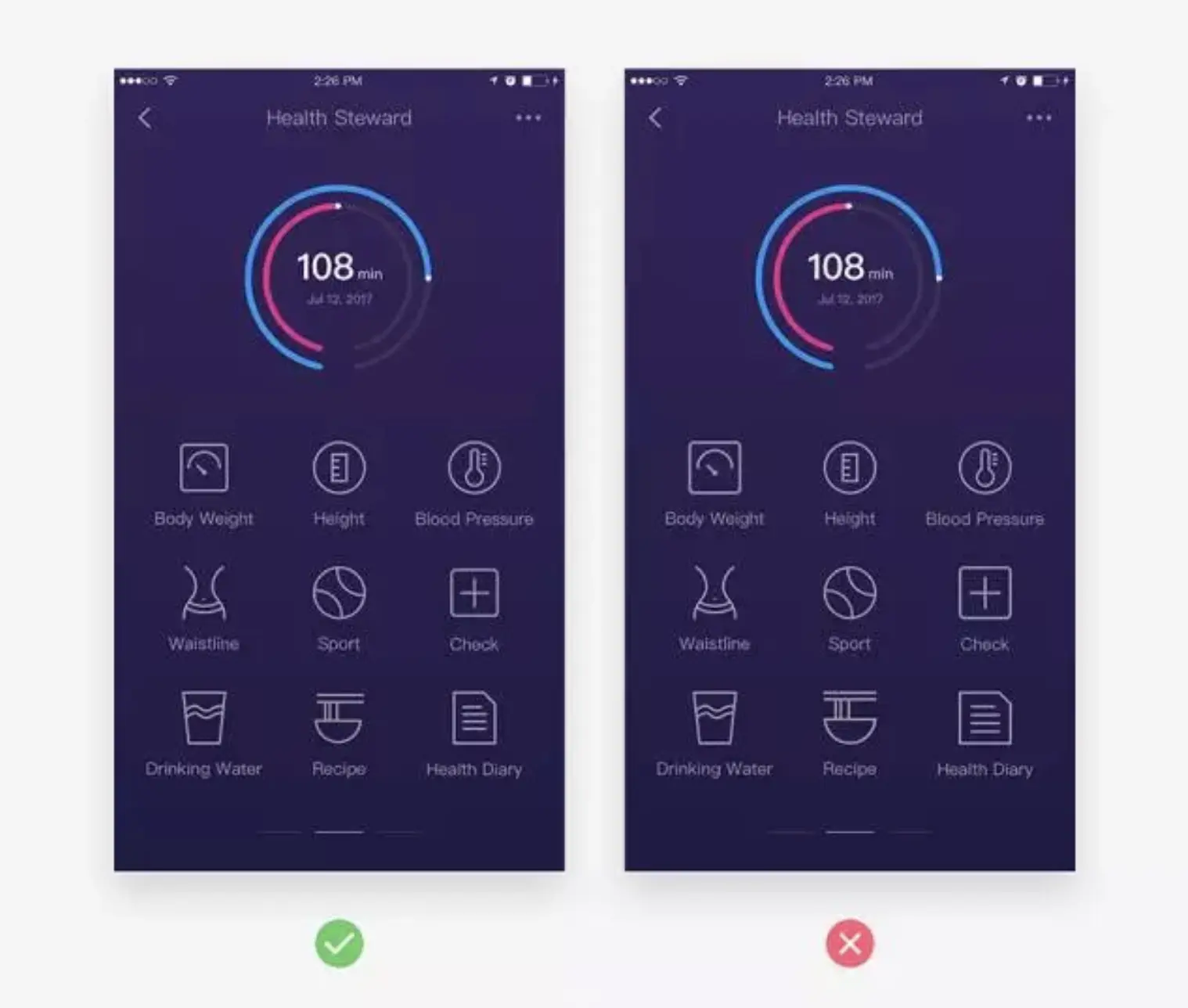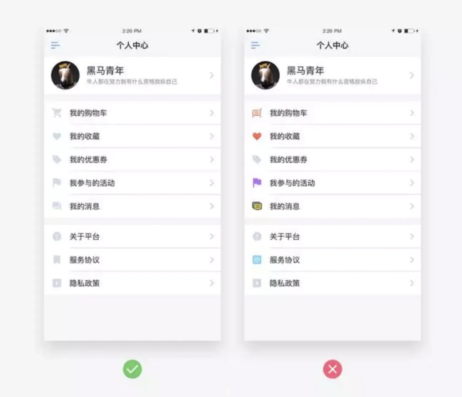- 去掉图标文案之后界面会显得更“逼格”,可是你确定用户能看懂图标表达的含义吗?我们在进行界面设计时,图标是为了辅助说明文案所传达的信息,如果去掉文案信息,那么需要图标本身带有很强的信息传达能力,确保用户能正确的识别。
