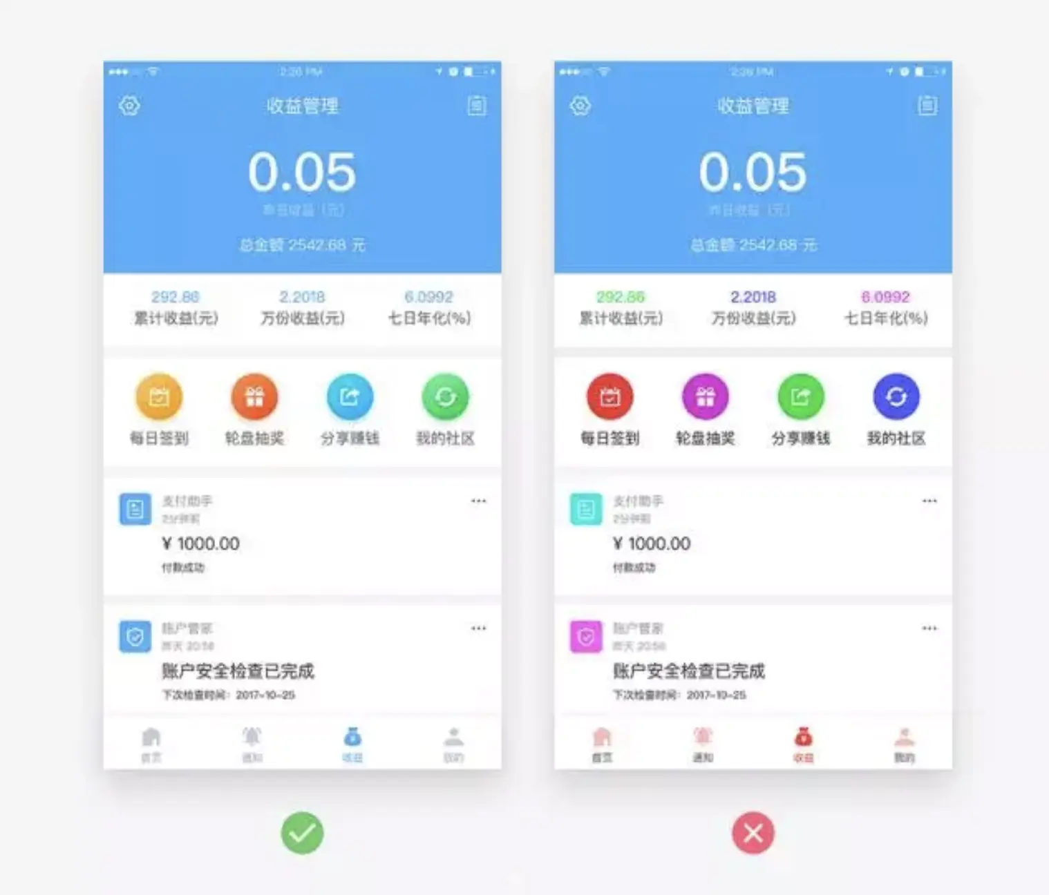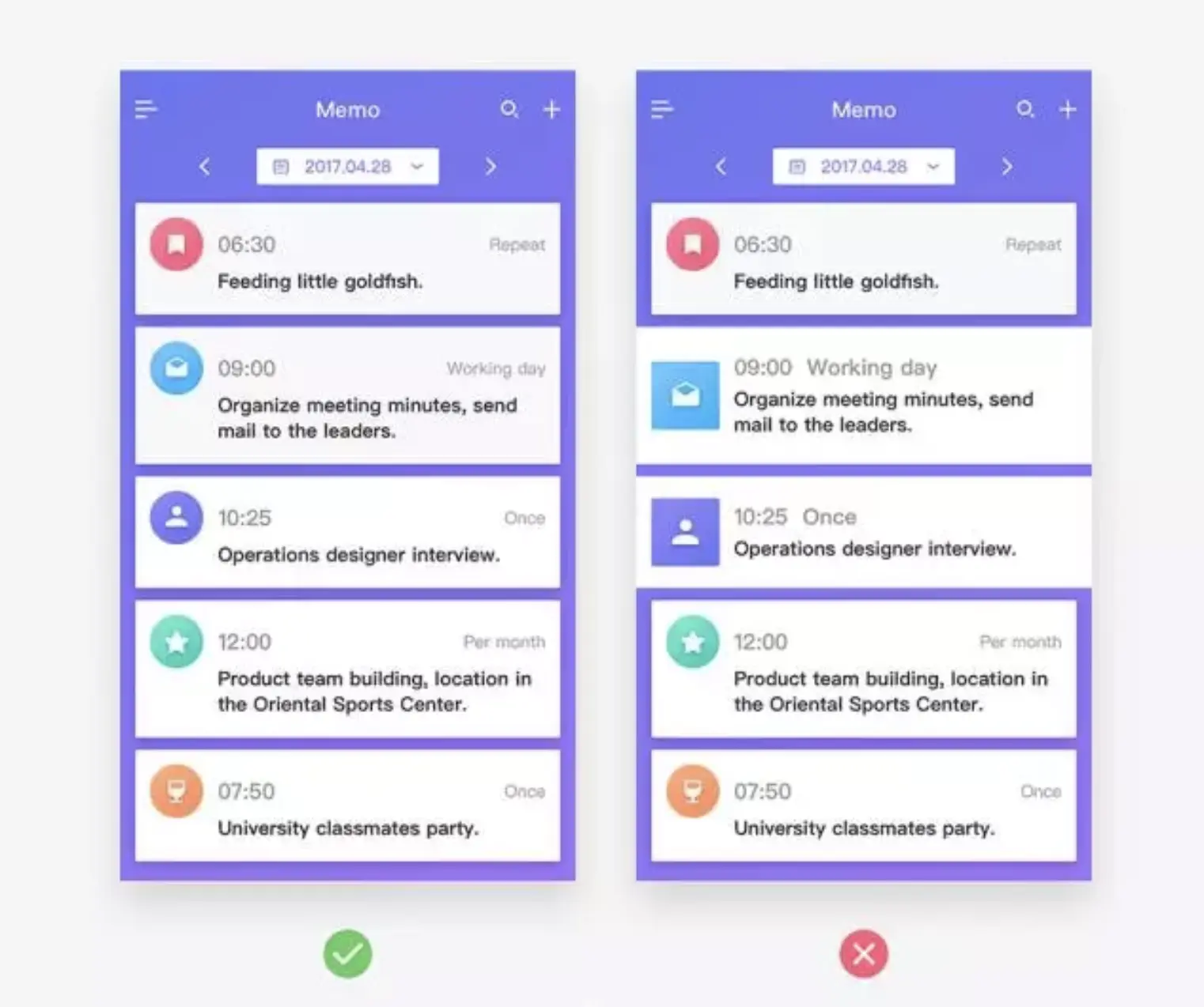- 相同的信息模块采用统一的设计表达,不要为了变化而加强用户的理解。前后信息设计的多样性也许在视觉上面更加丰富,可是用户会理解为这是两个不同的模块,操作会不会也不同,无形中就增加了用户的思考时间和学习成本。