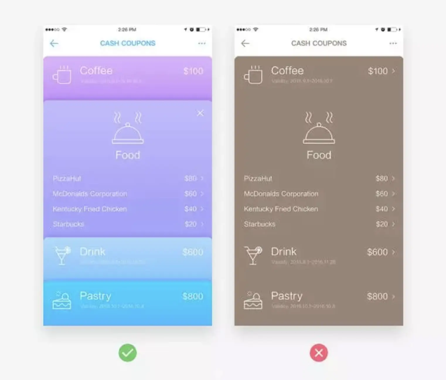 - 通过对比可以让信息模块更加独立,界面层级关系更加丰富。案例中以不同的背景颜色区分不同的信息模块,提升了整个界面的节奏感。颜色的选择可以是同色系中不同明度的梯度表现,也可以选择不同色相的穿插搭配。