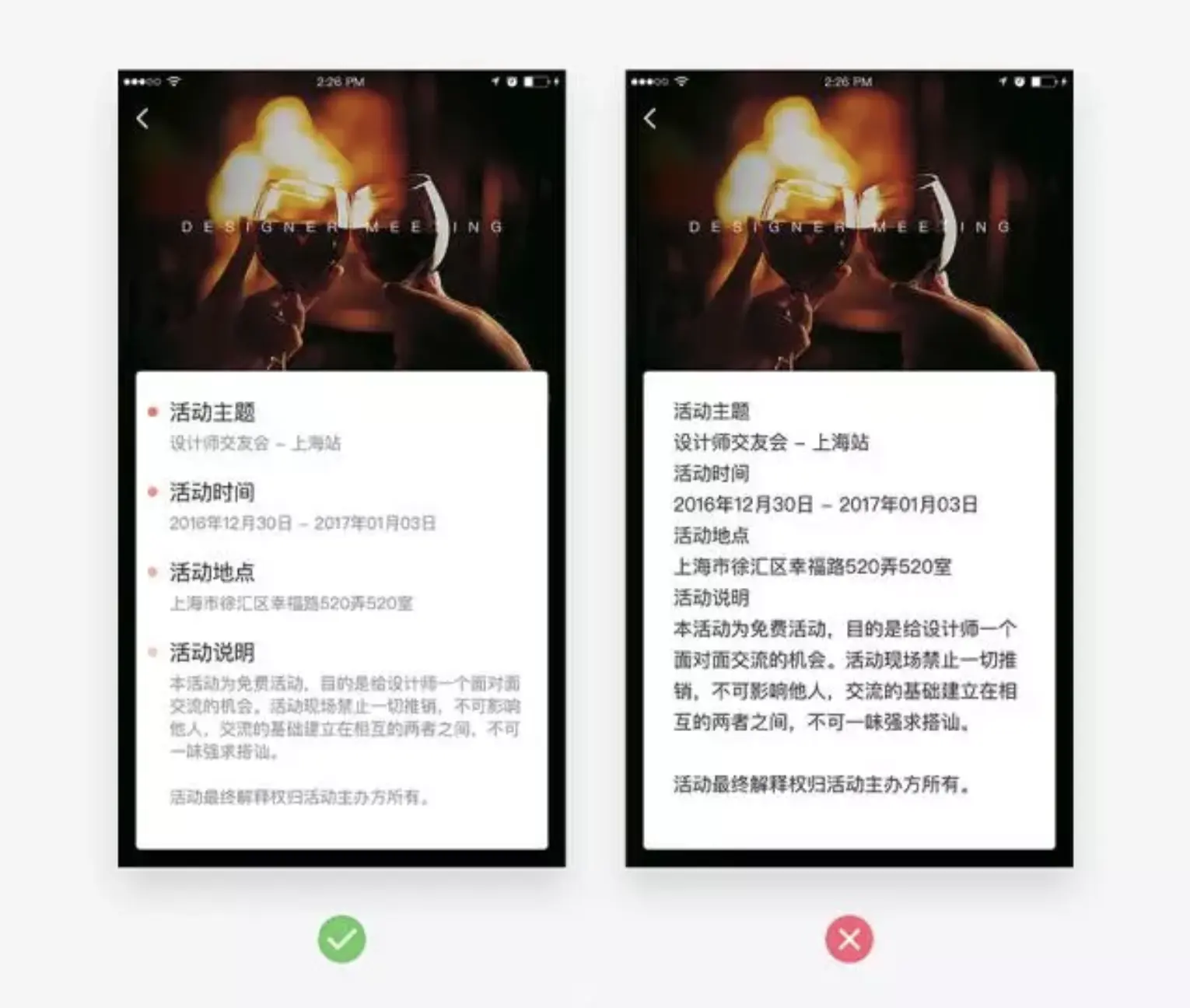 - 设计需要准确的把握“度”,过度的设计会干扰信息的传达。减少不必要的设计元素,让信息脱引而出,整个界面将会更加简洁清爽,也不会分散用户的注意力