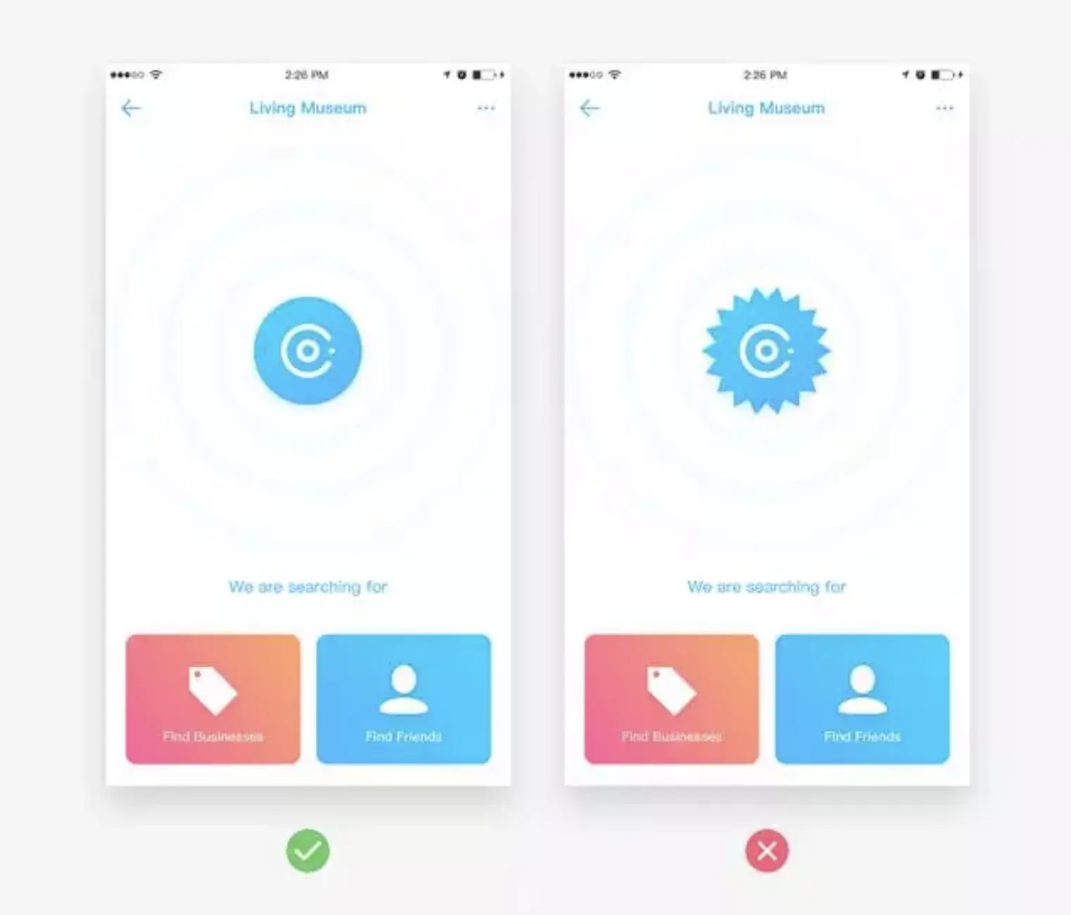 - 同一个界面出现多个图标时,我们需要保持整体的视觉平衡。并非是所有图标都采用相同的尺寸就能达到平衡,由于图标的体量不同,相同尺寸下不同体量的图标视觉平衡也不相同,例如相同尺寸的正方形会比圆形显得大。因此,我们需要根据图标的体量对其大小做出相应的调整。