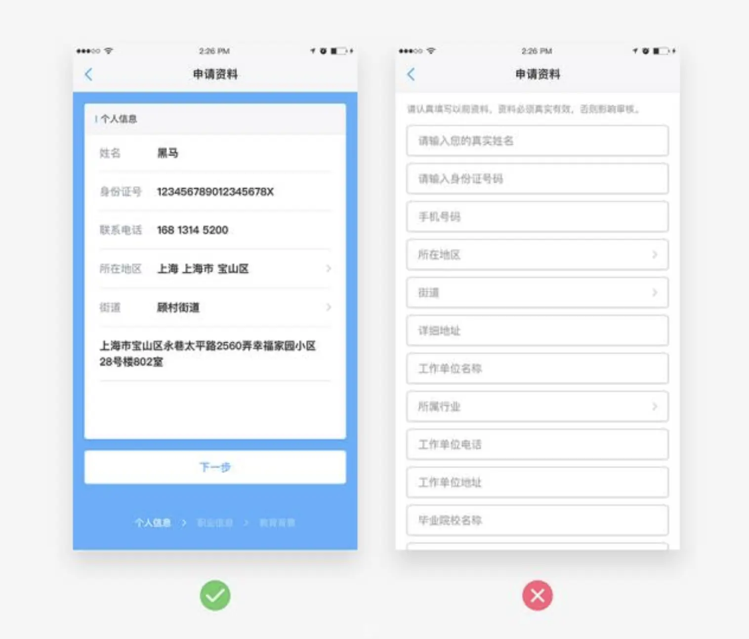 - 表单设计在界面中随处可见,看到一望无际的表单用户总是望而却步。为了缓解用户的这种心理活动,我们设计的时候通常会通过合并归纳相同属性的表单,采用逐步填写来让用户感觉内容很少,通过这样的视错觉让用户完成表单的填写。