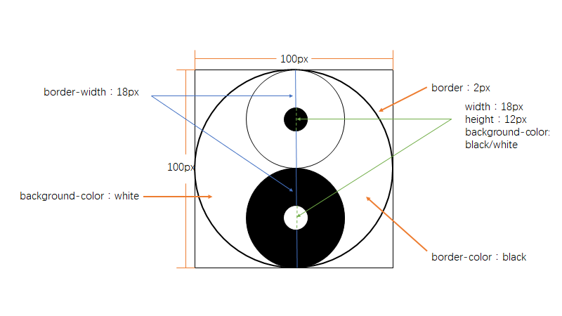 2.假设我们想画一个宽高为100px太极图,border 的粗细为2px,由于 border 的粗细占位4px,此时宽高已经变成了96px。关于 border-radius 请查看 MDN 文档。以下代码画出一个圆形。
