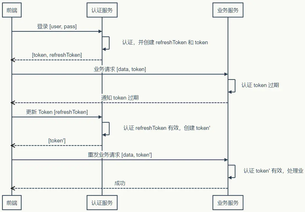 当然,如果 Token 过期了,前端仍然需要去认证服务更新 Token: