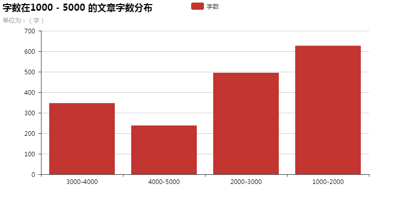 bar = Bar('字数在1000 - 5000 的文章字数分布',"单位为:(字)")