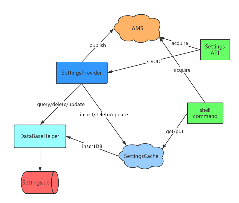 shell下使用的Settings command。无论是哪一个途径,对他们来说,SettingsProvider都是透明的,他们使用的都是SettingsProvider的Binder IPC接口。这里再次体现了Android设计架构的厉害,对涉及修改settings.db本身的操作实现、缓存持久化等操作只需要碰SettingsProvider;但如果想要修改暴露在外界的功能API,基本上只需要修改Settings API/command即可,两个功能模块之间不会相互干扰,可以独立运行和维护。