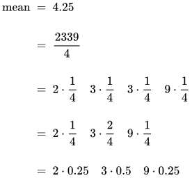 最后一个表达式就是一个普遍事实的例子:当我们计算平均值时,集合中的每个不同的值都由它在集合中出现的时间比例加权。
