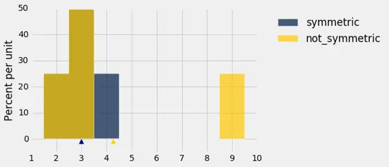 蓝色直方图表示原始的symmetric分布。 not_symmetric的金色从左端起始,和蓝色一样,但是最右边的条形到了数值 9。棕色部分是两个直方图重叠的位置。