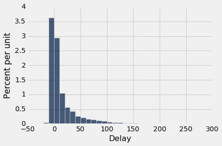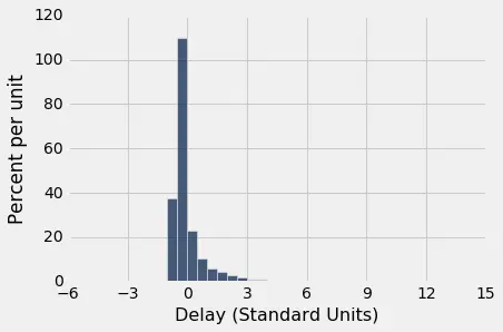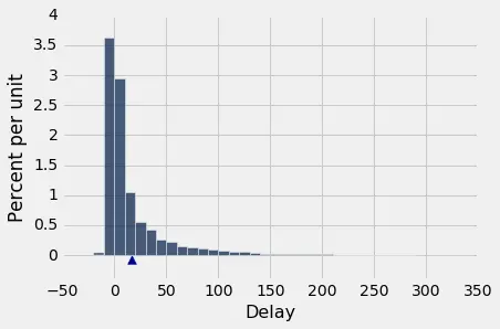 看看上面的样本均值的直方图中的标准差。在这三个里面,延误总体的标准差约为 40 分钟,因为所有的样本都来自同一个总体。