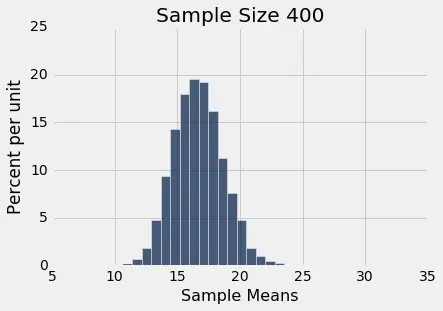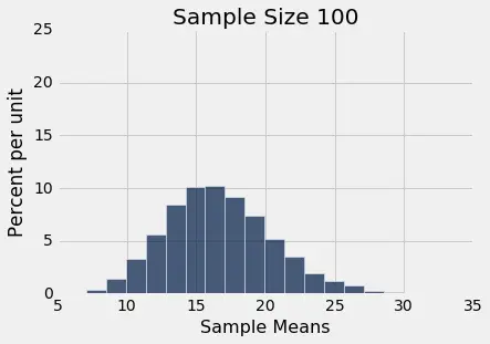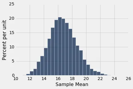 你还可以看到,样本均值的三个直方图中的每一个中心都非常接近总体均值。 在每种情况下,“样本均值的均值”非常接近 16.66 分钟,是总体均值。 每个直方图上方的打印输出都提供了这两个值。 像预期一样,样本均值是对总体均值的无偏估计。