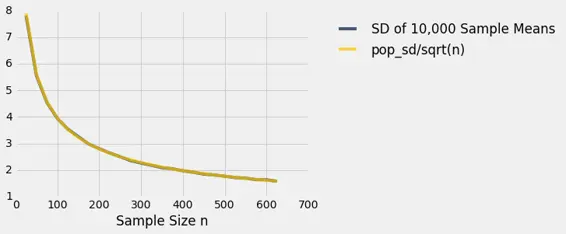 | Sample Size n | SD of 10,000 Sample Means | pop_sd/sqrt(n) |