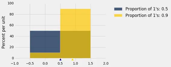 那么我们卡住了吗? 不,因为我们可以限制人口的标准差。 这里是两个这样的分布的直方图,一个是相等比例的 1 和 0 ,另一个是 90% 的 1 和 10% 的 0。 哪一个标准差更大?