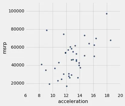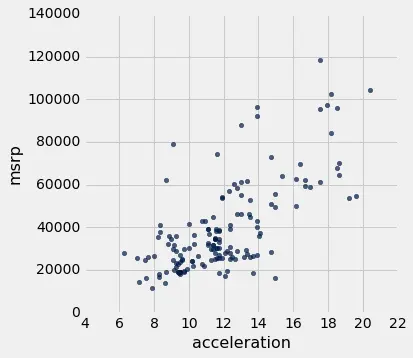下图是msrp与acceleration的散点图。 这意味着msrp绘制在纵轴上并且acceleration在横轴上。