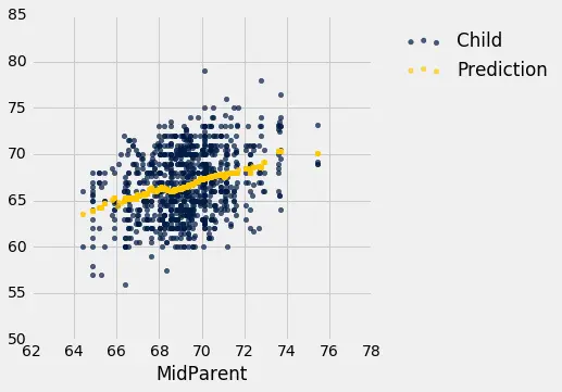 我们的方法是,基于新人的双亲身高周围的所有点来做预测。 为此,我们编写了一个名为predict_child的函数,该函数以双亲身高作为参数,并返回双亲身高在半英寸之内的,所有子女的平均身高。