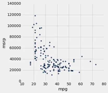msrp与mpg的散点图表明了负相关。 mpg较高的混合动力车往往成本较低。 这似乎令人惊讶,直到你明白了,加速更快的汽车往往燃油效率更低,行驶里程更低。 之前的散点图显示,这些也是价格更高的车型。