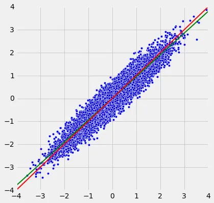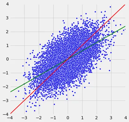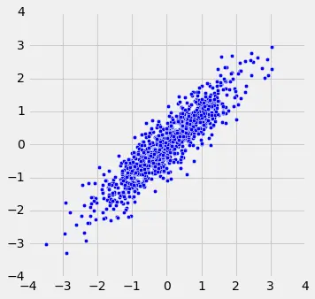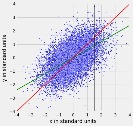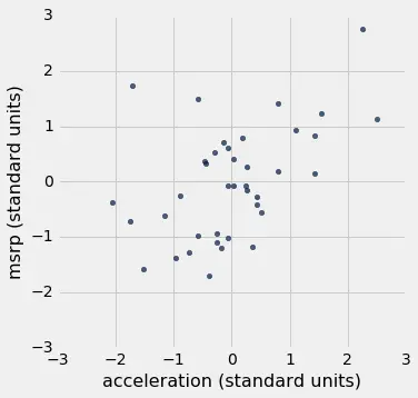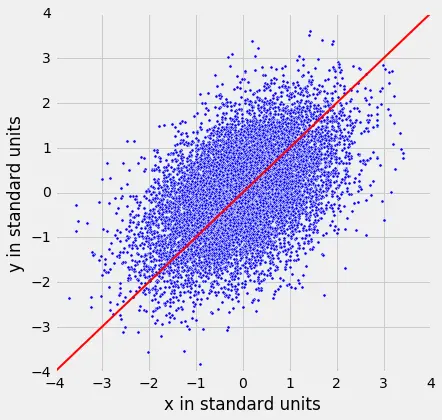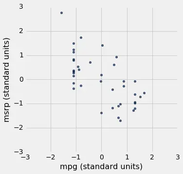 事实上,我们可以将所有的变量绘制成标准单位,并且绘图看起来是一样的。 这给了我们一个方法,来比较两个散点图中的线性程度。