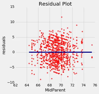 作为一个数值示例,这里是高尔顿数据集中,基于双亲高度的子女高度的回归的残差均值。