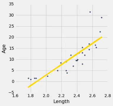 如果我们可以衡量海牛的长度,对于它的年龄我们可以说什么呢? 让我们来看看我们的数据说了什么。 这是一个长度(预测变量)和年龄(响应变量)的回归。 这两个变量之间的相关性相当大,为 0.83。