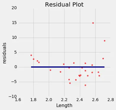 在长度的较低一端,残差几乎都是正的;然后他们几乎都是负的;然后在较高一端,残差再次为正。 换句话说,回归估计值过高,然后过低,然后过高。 这意味着使用曲线而不是直线来估计年龄会更好。
